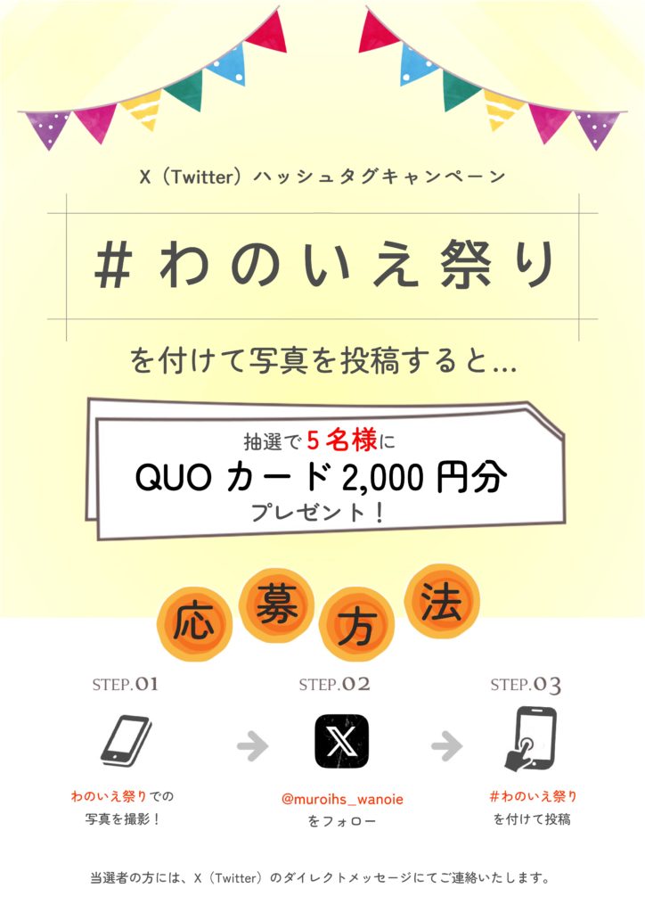 X(Twitter)でムロイハウジングのアカウントをフォロー&わのいえ祭りの写真を投稿していただきますと、抽選で5名様に「QUOカード2,000円分」をプレゼントします!